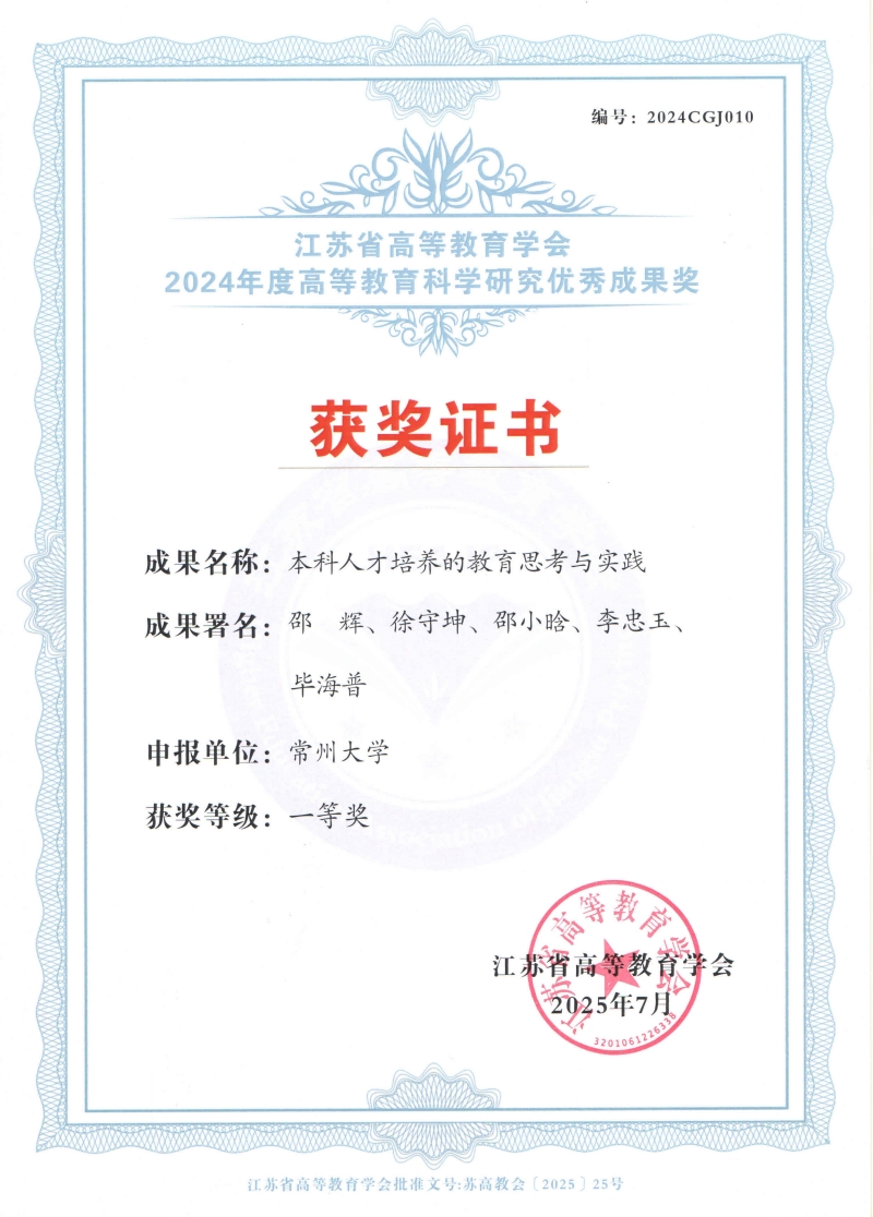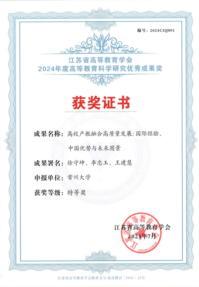 本届大会以“教育强国建设:溯源四十载,智启新征程”为主题,来自省内外学会代表、教育行政部门负责人、高校负责人、专家学者及学会理事监事等400余人参会,共绘教育强国背景下的江苏高质量人才自主培养新蓝图。会上,我校喜获多项荣誉。校党委书记徐守坤教授作为第一作者发表的论文《高校产教融合高质量发展:国际经验、中国优势与未来图景》和国家教学名师邵辉教授作为第一作者发表的论文《本科人才培养的教育思考与实践》,分获江苏省高等教育学会2024年度高等教育科学研究优秀成果特等奖与一等奖。因在组织教师参与高水平教学竞赛中的出色工作,学校被授予第五届江苏省本科高校教师教学创新大赛“优秀组织奖”。