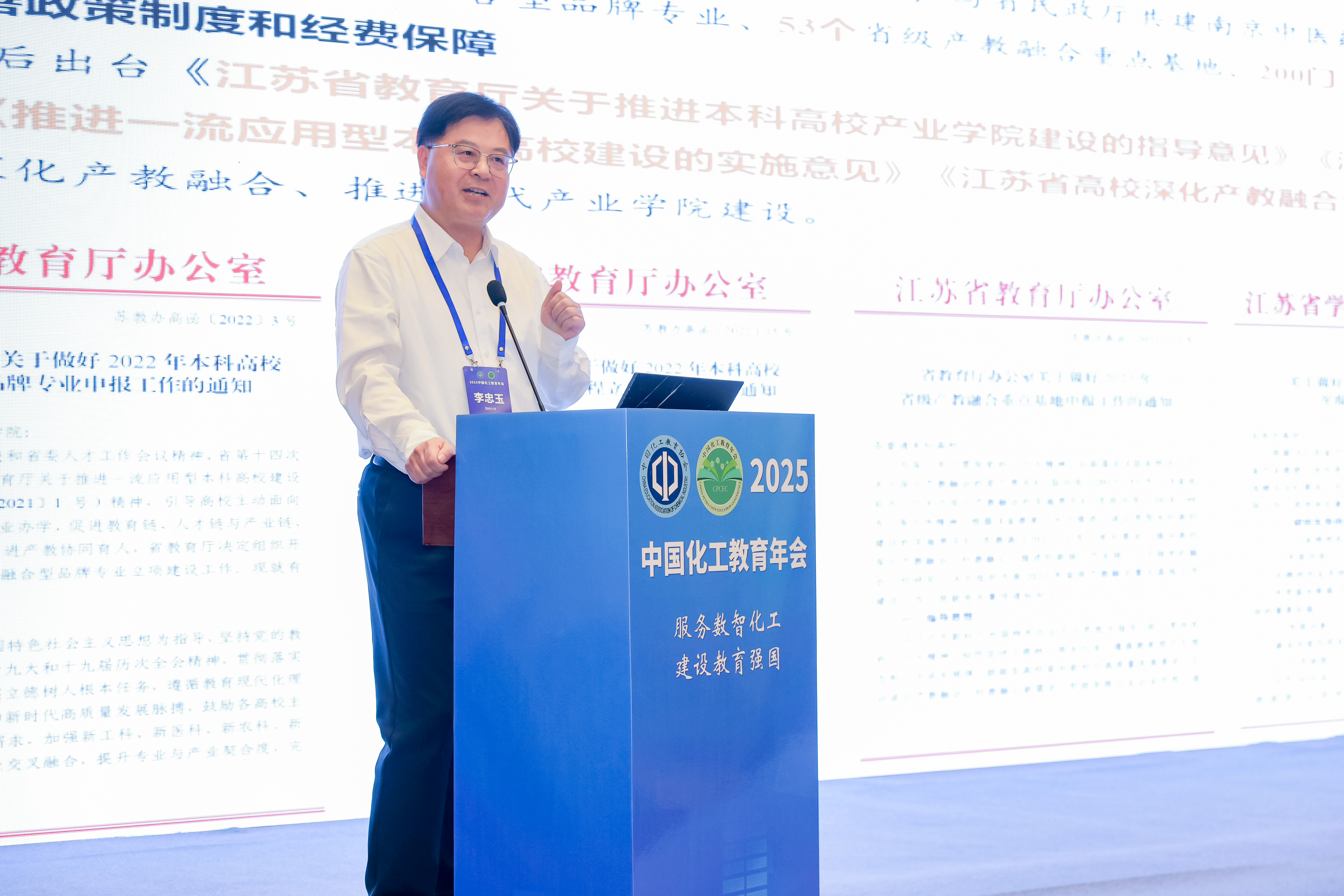 李忠玉代表产教融合工委会和常州大学致辞。他指出,产教融合已成为打通人才自主培养、科技创新与产业升级的关键路径,更是培育行业新质生产力的重要支撑。他表示,产教融合工委会旨在搭建校企政研合作平台,推动产教融合工作从个体发力向系统共建迈进。这既是深入贯彻落实习近平总书记关于一体推进教育科技人才发展重要论述和党的二十届四中全会精神的有力举措;也是积极响应《教育强国建设规划纲要》的部署要求,构建协同育人新生态,为化工行业高质量发展注入持久动力的具体行动。常州大学将以更主动的姿态和更有力的举措,服务国家战略需求和行业产业需求,不断深化与创新产教融合,为中国化工教育协会和我国化工行业高质量发展,贡献更多“常大力量”。