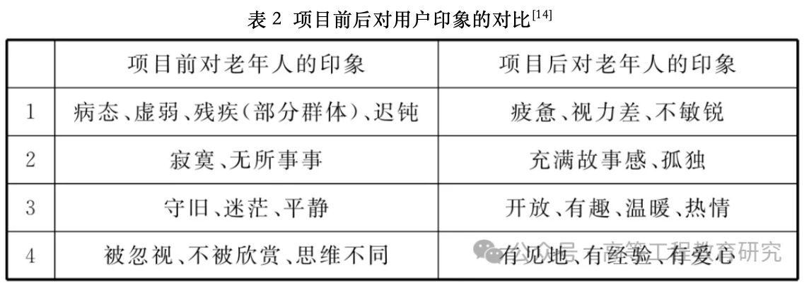 年龄歧视在社会上是客观存在的事实,在此背景下,学生对老年人的共情是非常重要的一环。同理心活动过程中,学生通过亲身经历体会到新的见解。“我意识到了,如果您坐在轮椅上,人们会为您提供帮助。如果我坐在轮椅上,我会觉得自己想保持尽可能多的独立性”。[14] 学生通过项目,理解老年人如何在依赖和独立的感觉中挣扎,寻找到用户隐藏的痛点与需求。多名学生表示:“我可以更好地理解他们的问题,关注、思考过程以及如何与他们互动”“我认为我将能够从他们的角度思考并同情他们的处境”。[14] 项目前后学生对用户印象的具体变化见表2。期末调研与教学反思显示,学生共情认知能力获得显著提升。